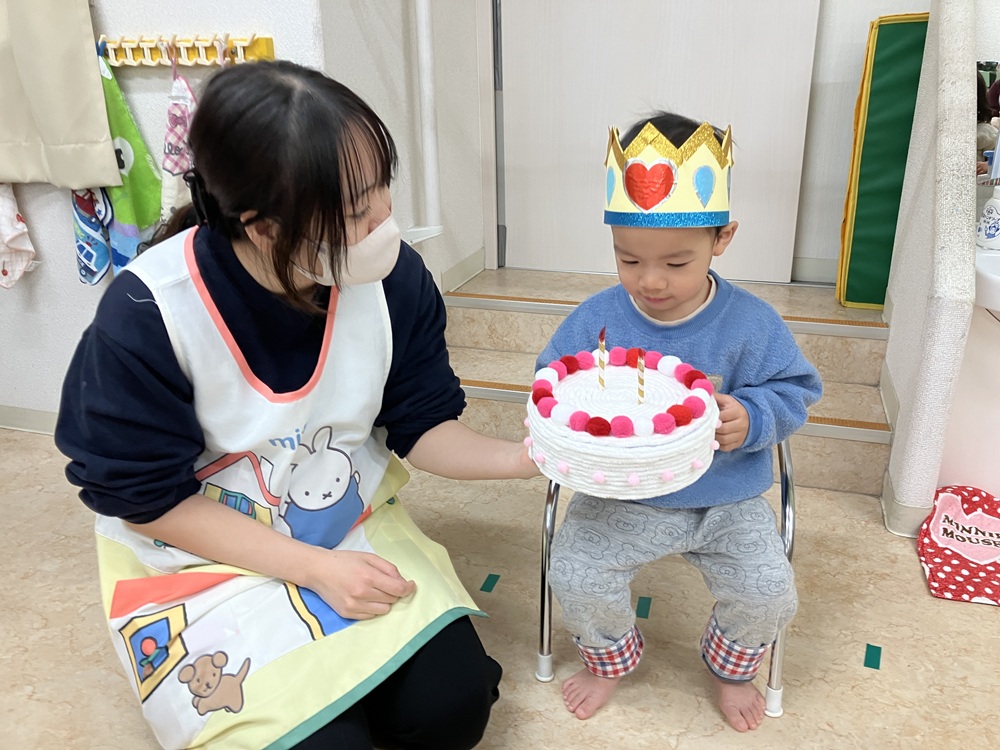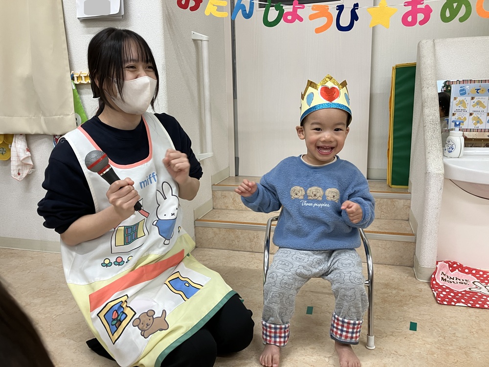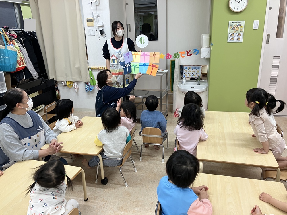 12月のお誕生会では、ペープサート「だれのプレゼントかな」を行いました。食べ物からプレゼントの持ち主を当てるクイズ形式の出し物で、積極的に参加する姿が見られました。プレゼントから玩具が出てきて、ジングルベルが流れると、「サンタさんだ」と大興奮のお子様たちでした。