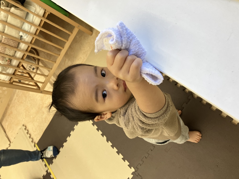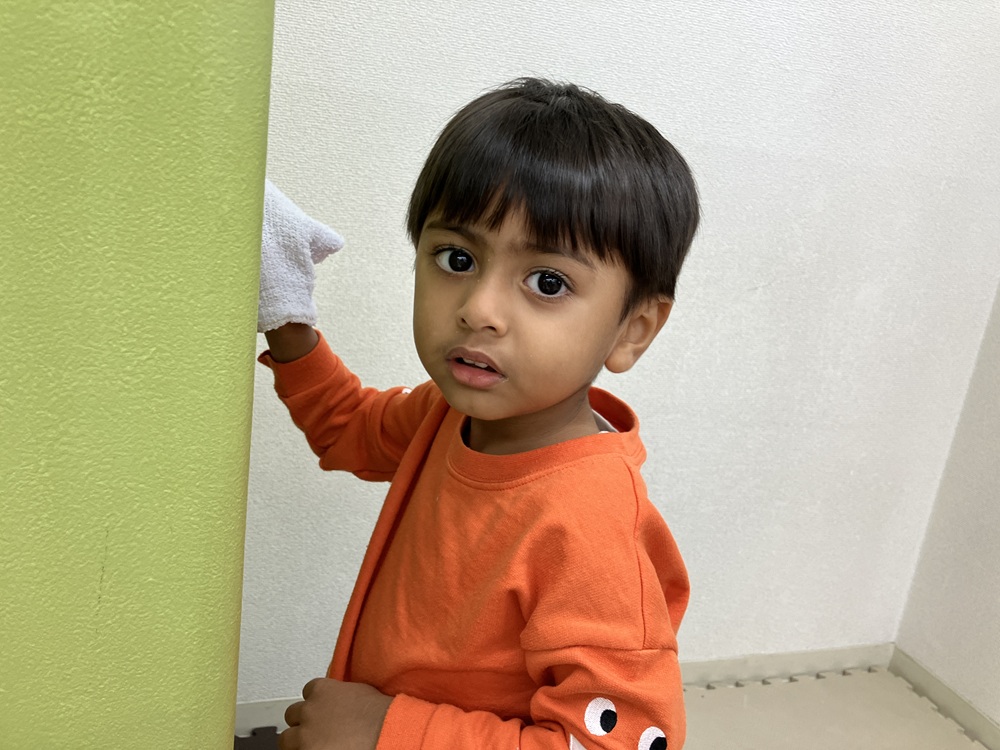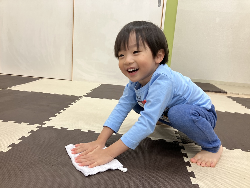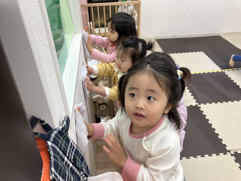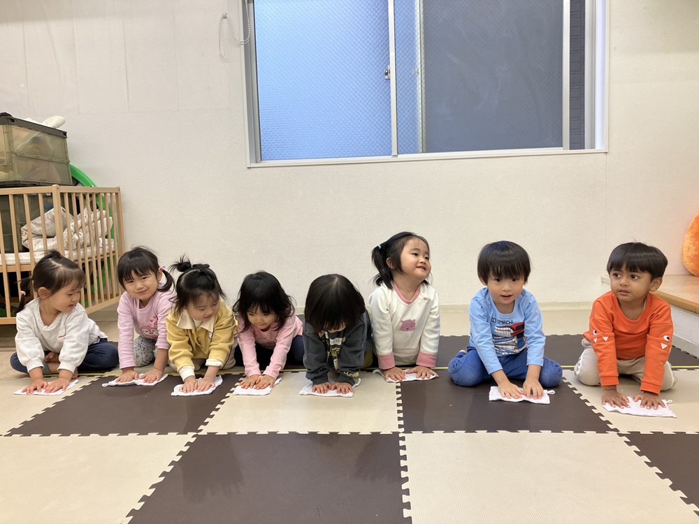 年内最終登園日、みんなで大掃除をしました。「ありがとうの気持ちでピカピカにしよう」と伝えると、張り切って拭いていました。高い所や細かい所にもよく気付くお子様たちでした。身の回りのものに感謝の気持ちをもつ経験となっていたら嬉しいです。