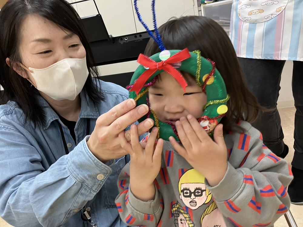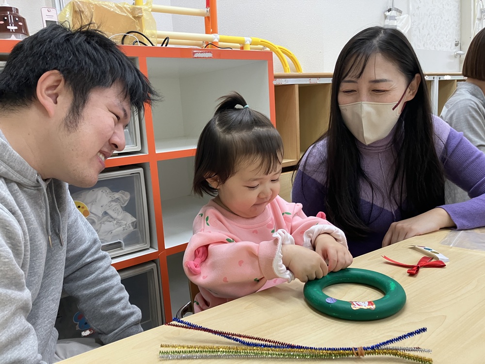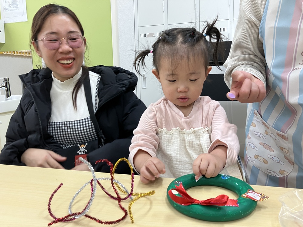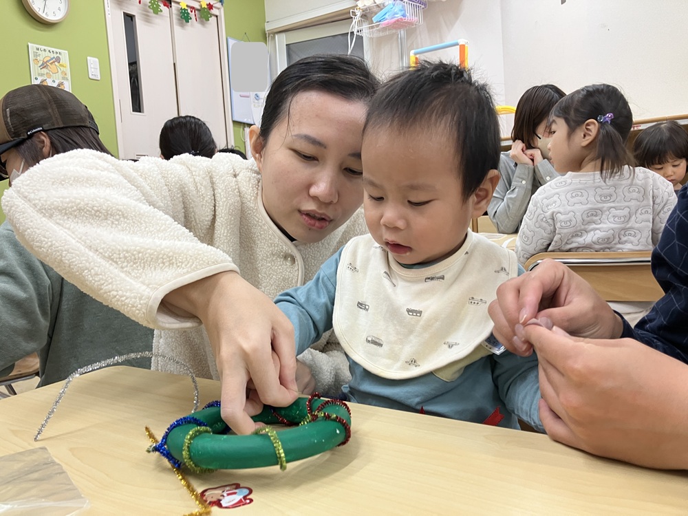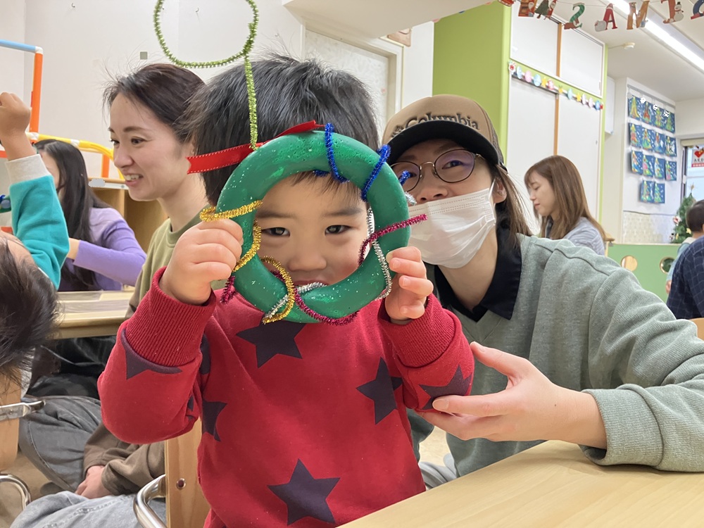 保育参観では、パネルシアター「あわてんぼうのサンタクロース」を見聞きした後、親子製作「クリスマスリース作り」を行いました。モールやシールで飾りつけ、素敵なオリジナルリースが完成。保護者の皆様との製作は、お子様がとても嬉しそうで、普段の製作とはまた違った表情が見られ、微笑ましかったです。