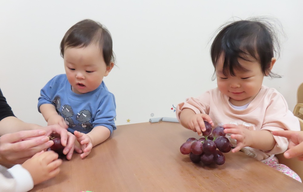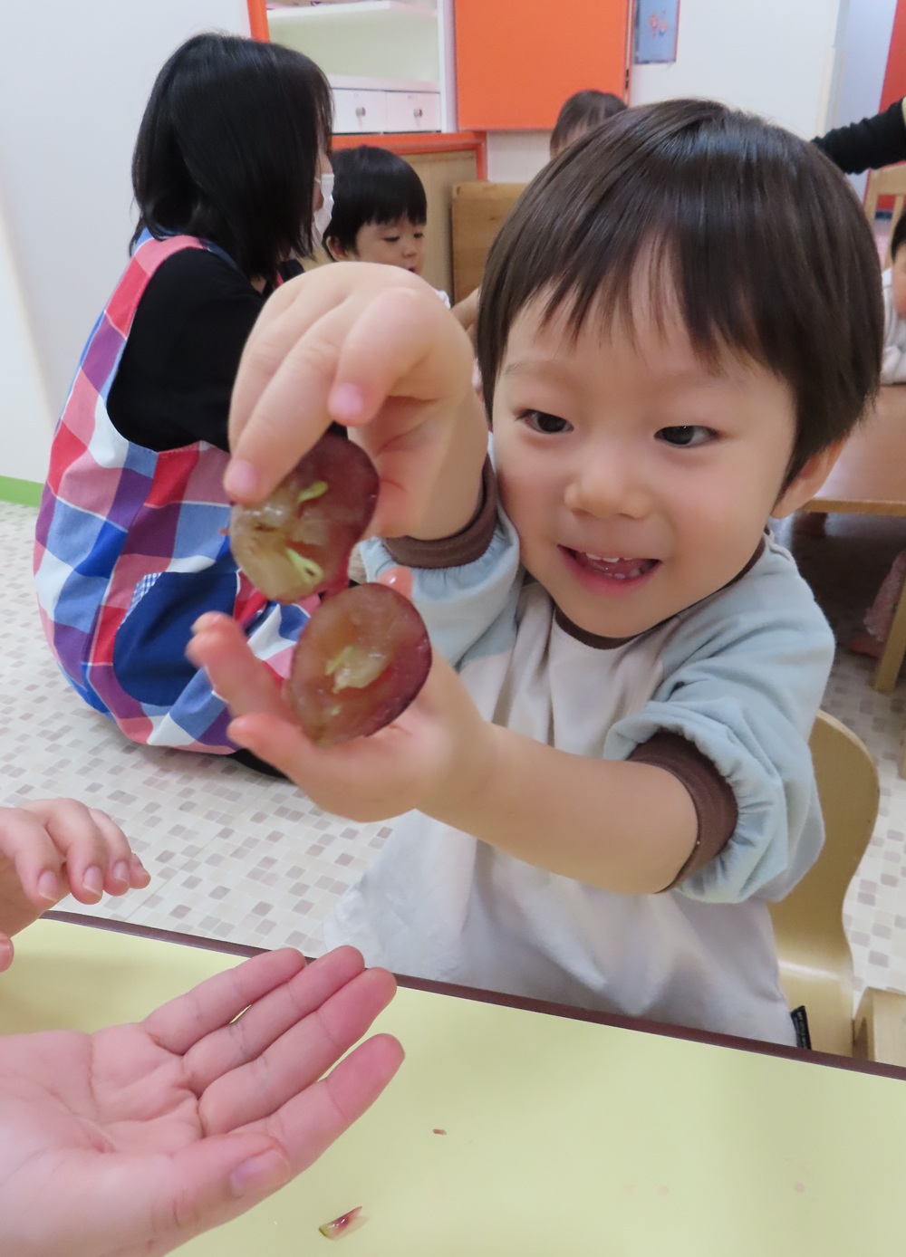 また、保育者と一緒にぶどうの皮むきもして「いいにおい」と言いながら夢中でむいていました。