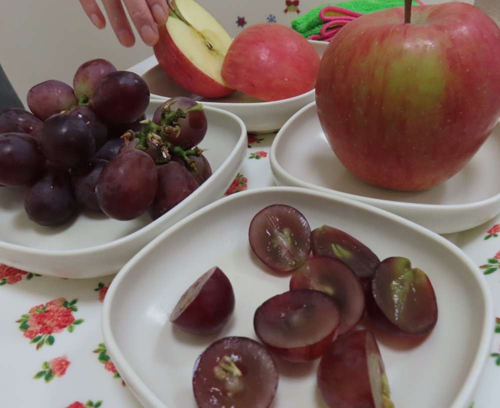 りんごとぶどうの観察をしたり、匂いをかいだりしました。