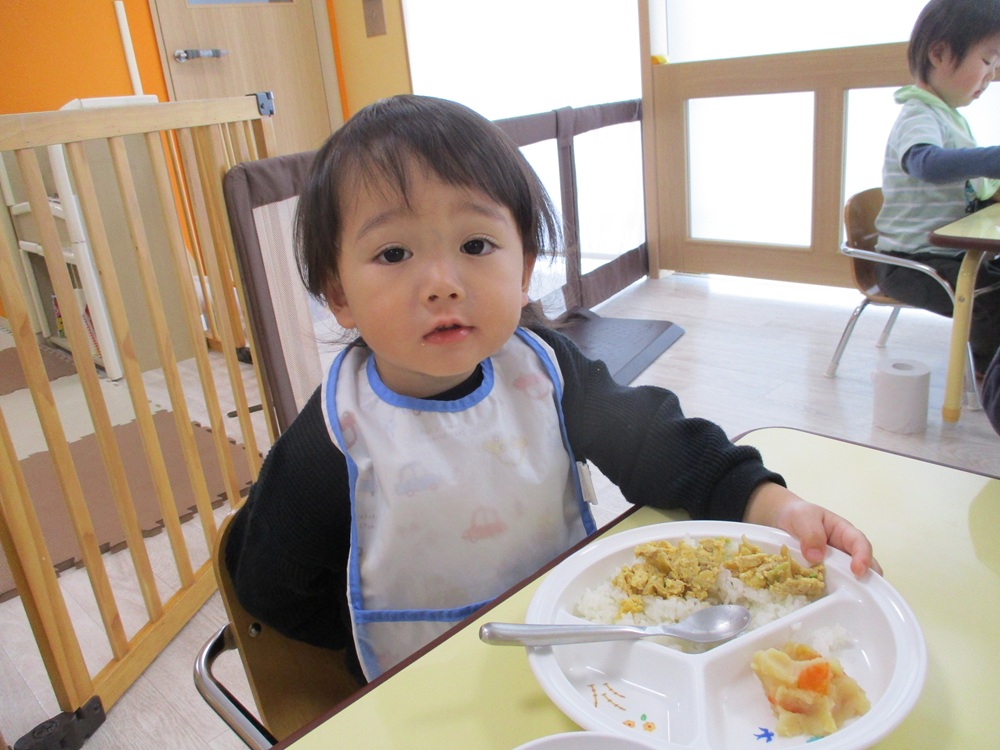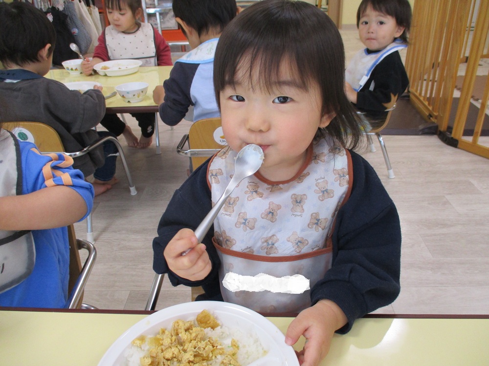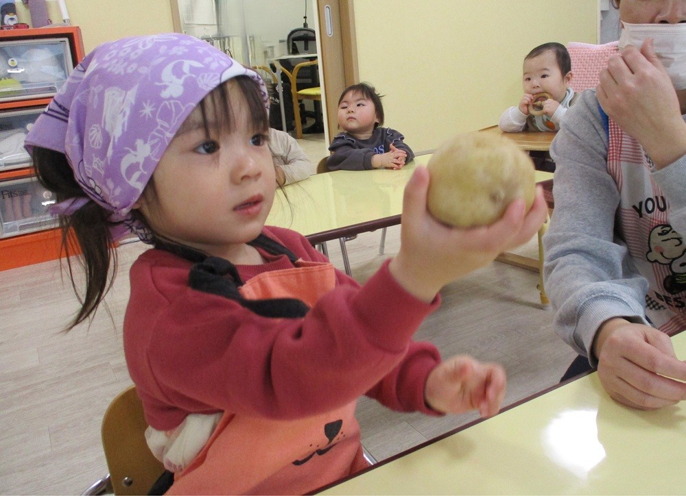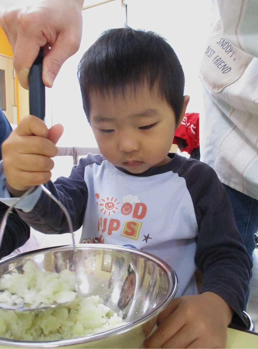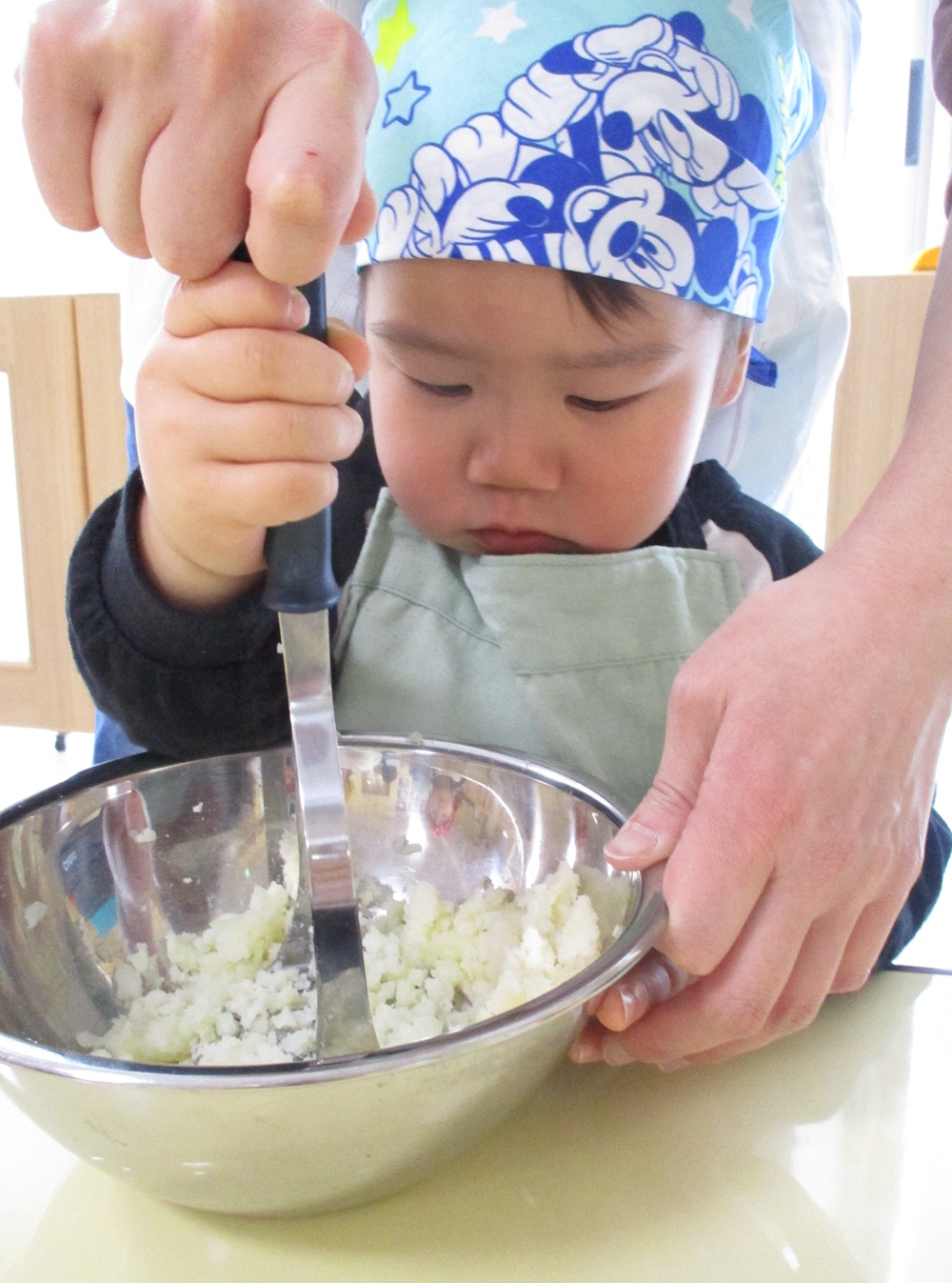 次は茹でたじゃがいもをボールに入れて、保育者と一緒にマッシャーで潰す作業をしました。「やりたい、やりたい」と興味を持ち楽しそうでした。