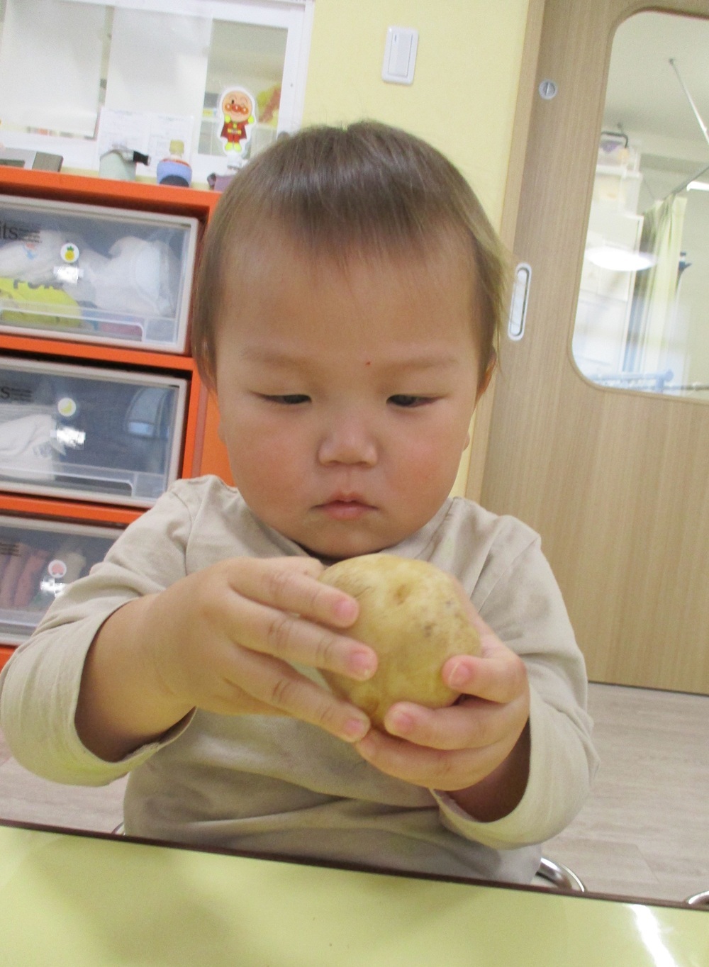 「おおきいね」「じゃがいも」などと言いながら、手触りを感じたり、匂いをかいだりしていました。