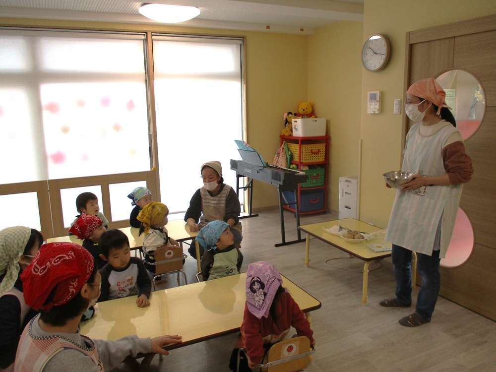 エプロン、三角巾を付けて手洗いをしてから椅子に座りました。