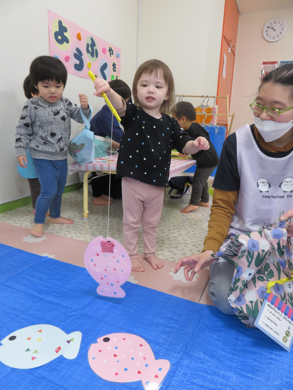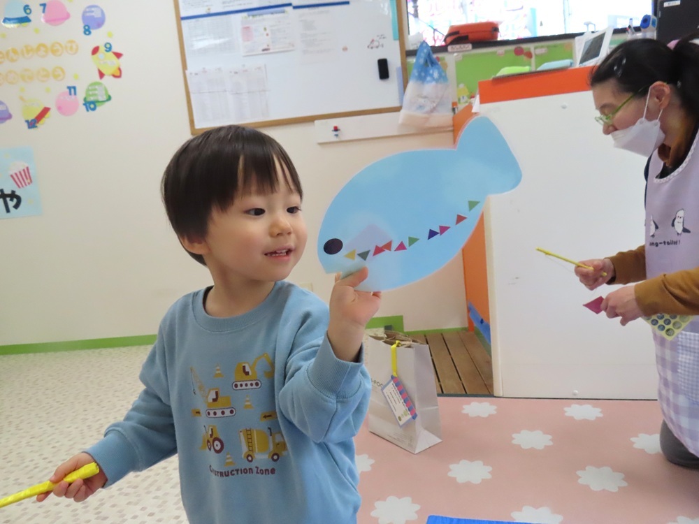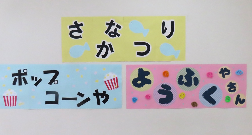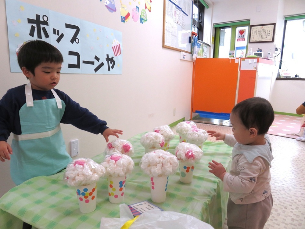 今年のお店屋さんごっこは、「さかなつり屋さん」「ポップコーン屋さん」「ようふく屋さん」をしました。