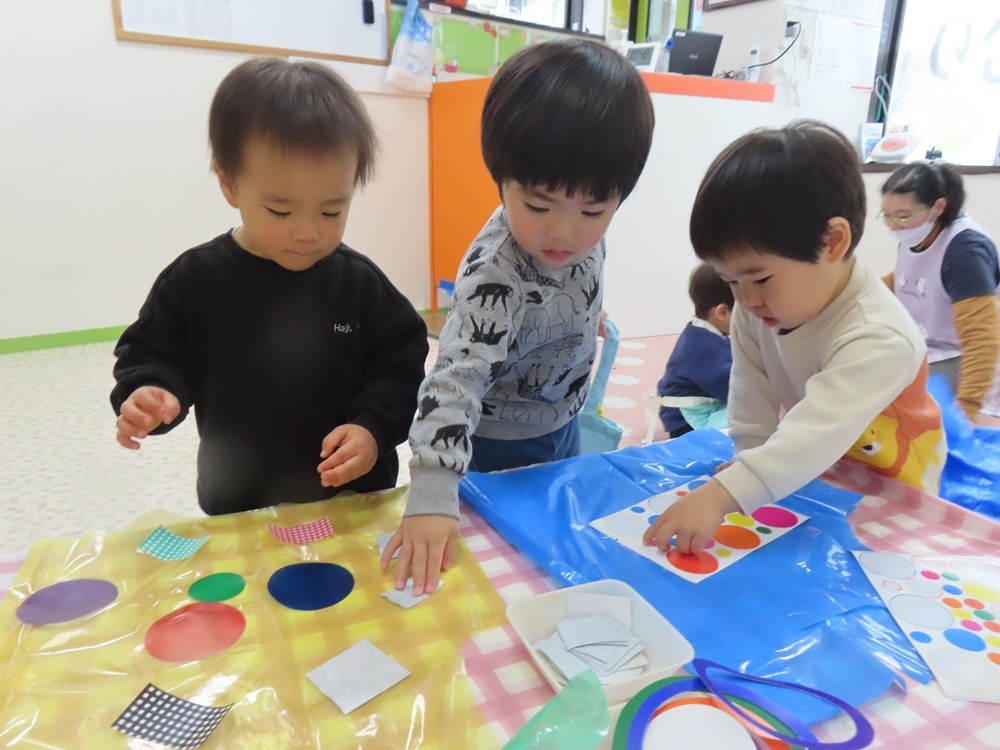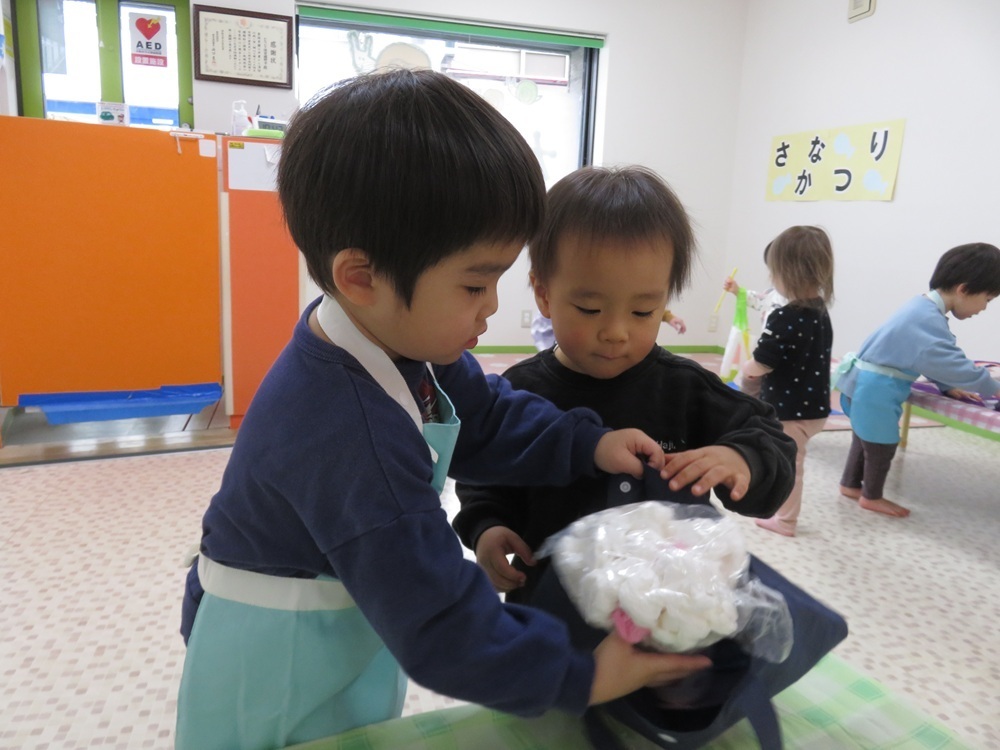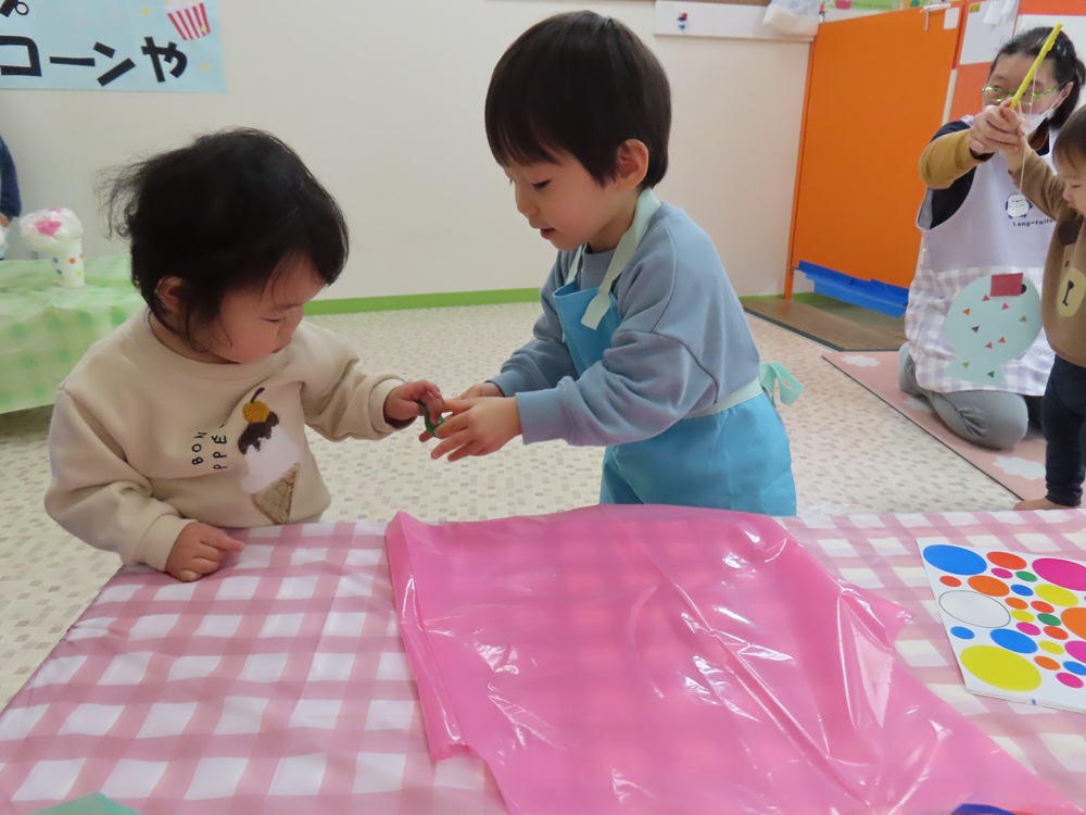 0,1歳児のお子さまは、お兄さんたちに買い物カードのシール貼りをお手伝いしてもらいながら、お買い物を楽しんでいました。