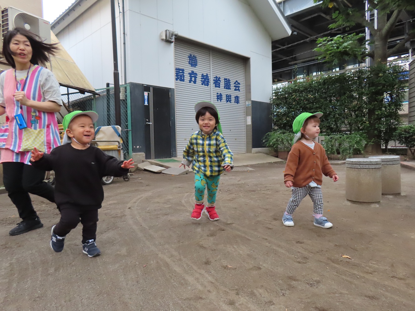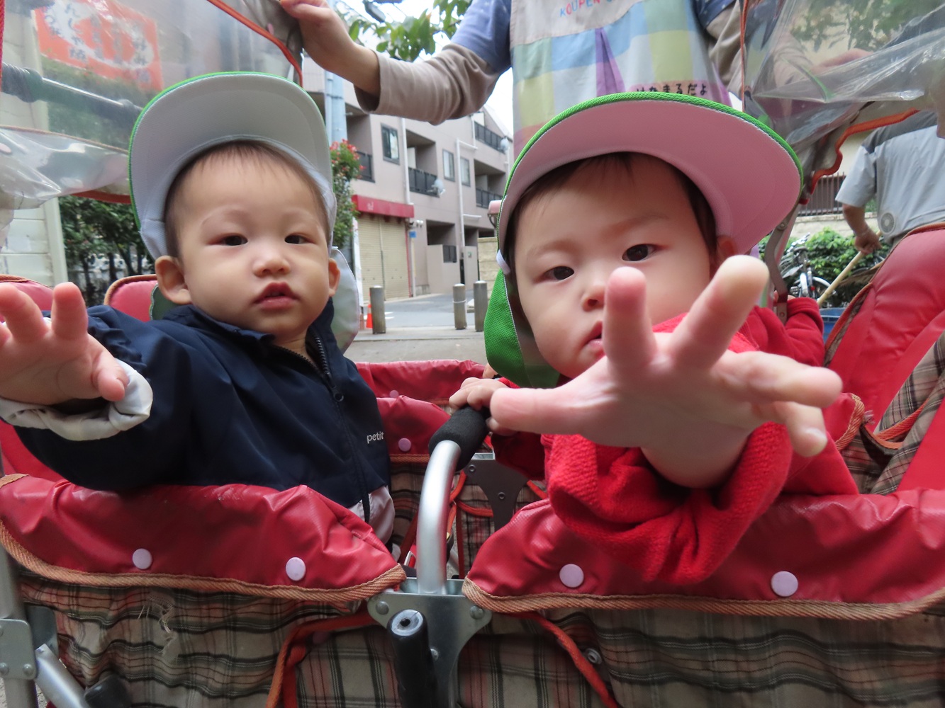 他にもカートから周りの様子を観察し保育者の言葉掛けに「あーうー」と答えてくれたり、保育者と元気いっぱい走ったりと戸外遊びを楽しんでいます。
