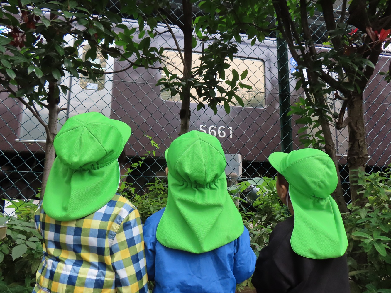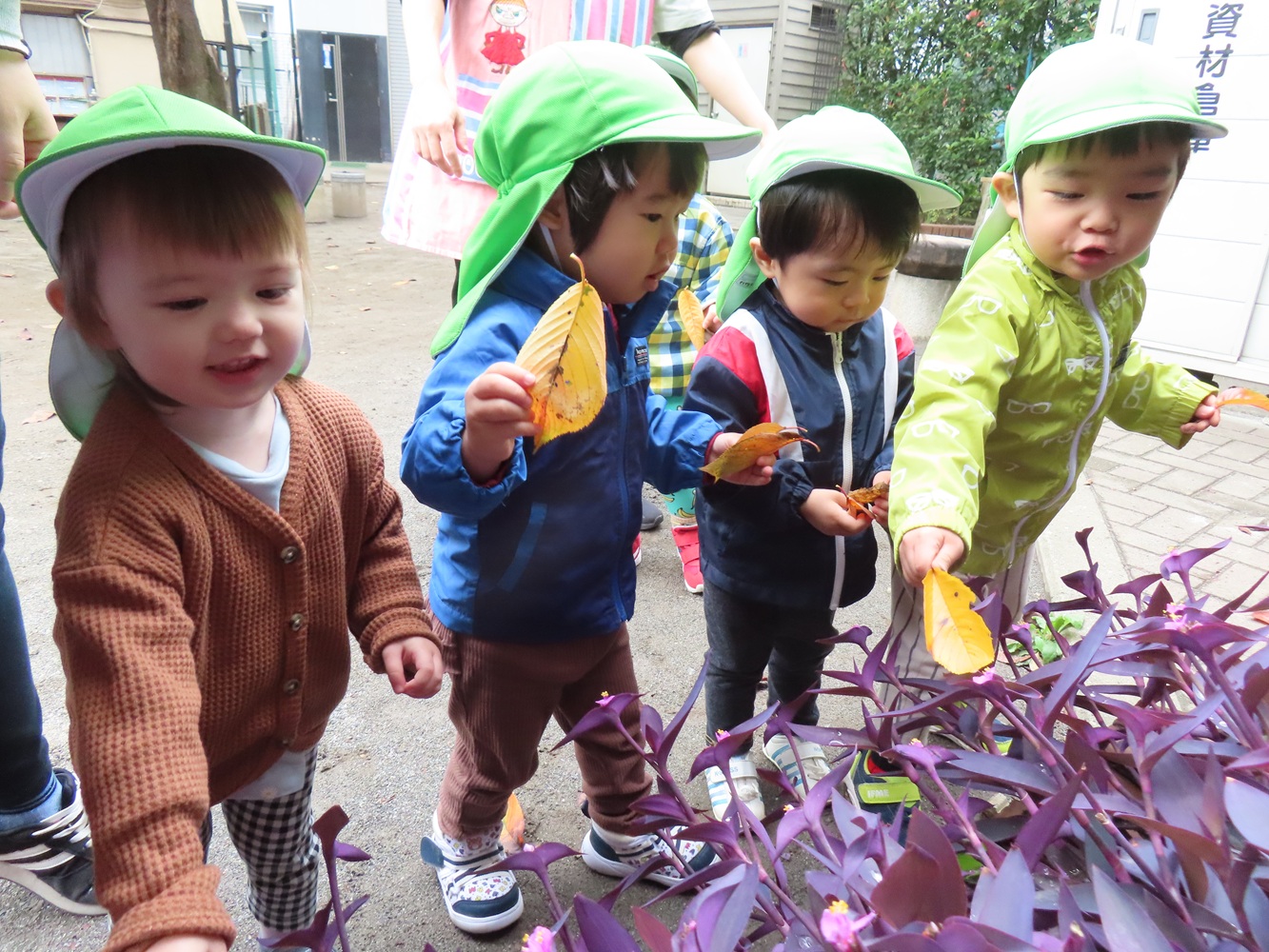 公園沿いに電車が通るため、お友達と走る電車を観察したり「何色かな?」と色当てクイズをしたりしています。落ち葉も色づいてきて、手に取り他の葉の色と比べて色の違いを楽しんだりもしています。