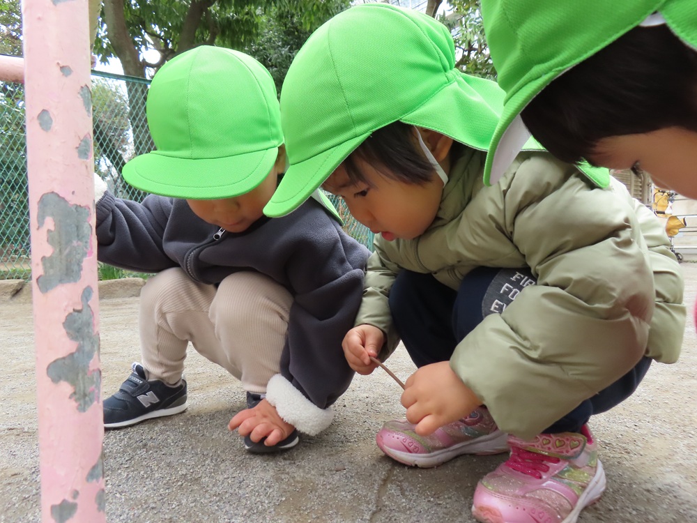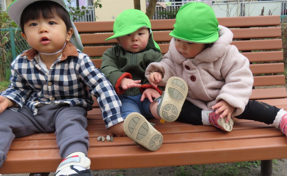 お友だちとベンチに座って日向ぼっこをしたり、アリさんを見つけて観察したりしています。